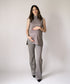 La blusa sin mangas con cuellito alto aporta un aire moderno y elegante, mientras el pantalón flare con panel suave y contenedor acompaña tu pancita sin apretar, realzando tu baby bump.