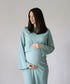 Un set que combina frescura, estilo y muchísima versatilidad. Confeccionado en una tela con textura en un tono azul menta divino, la blusa es crop de cuello redondo con manga flare, femenina y con mucha onda, y una falda midi tipo lápiz que abraza tu baby bump. Es ideal para un baby shower, un evento formal o para el día a día si lo llevas con tenis. Súper cómodo y fácil de combinar, una de esas piezas que te salvan el look sin esfuerzo.