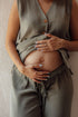 Set de chaleco y Pantalón Flare Low Rise en una tela ligera color verde sage. Un set en tendencia que redefine el denim en el embarazo. Chaleco con botones de madera y corte estructurado que enmarca tu figura, combinado con pantalón silueta wide leg con tiro bajo que se adapta perfecto a tu pancita durante el embarazo… y también en el posparto